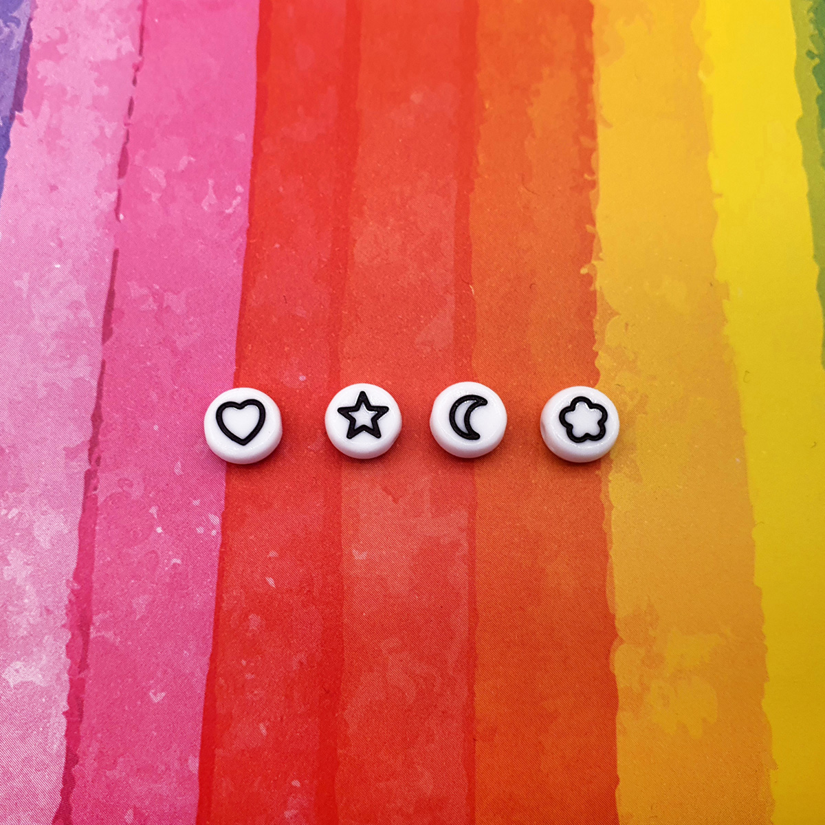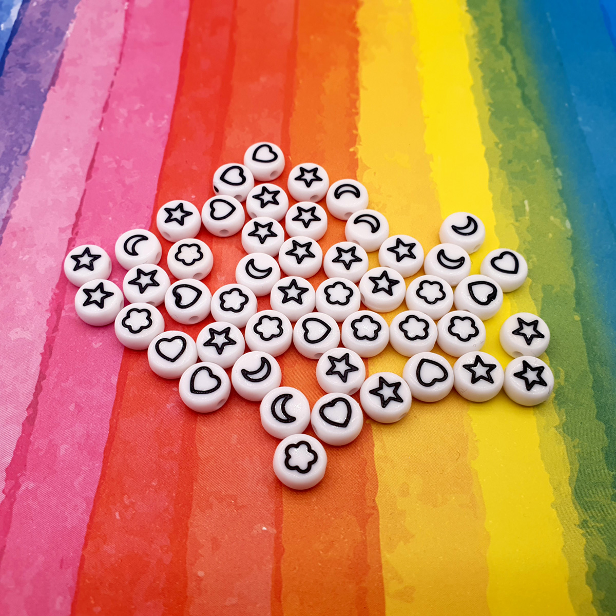 Bílé akrylové korálky s černými symboly srdíčko, měsíček, kytička a hvězdička. Vhodné jako doplněk k našim dalším korálkům, jako například: Bílé korálky s barevnými písmenky Abeceda. Jde o velmi lehké korálky se širokými průtahy, kterými můžete návlekový materiál provléknout i vícekrát. Jako návlekový materiál můžete použít silon voskované šňůrky, gumičky. Korálky můžete využít pro tvorbu náramků nebo náhrdelníků.