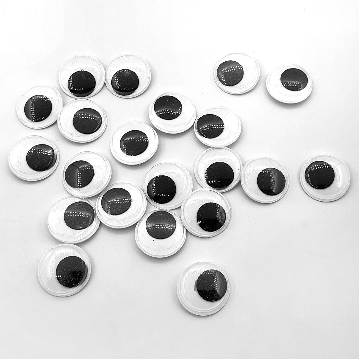 Černobílé pohyblivé oči, určené přišití na jakýkoliv plátěný nebo pletený povrch. Na zadní straně mají očička malé očka k přišití na podklad.