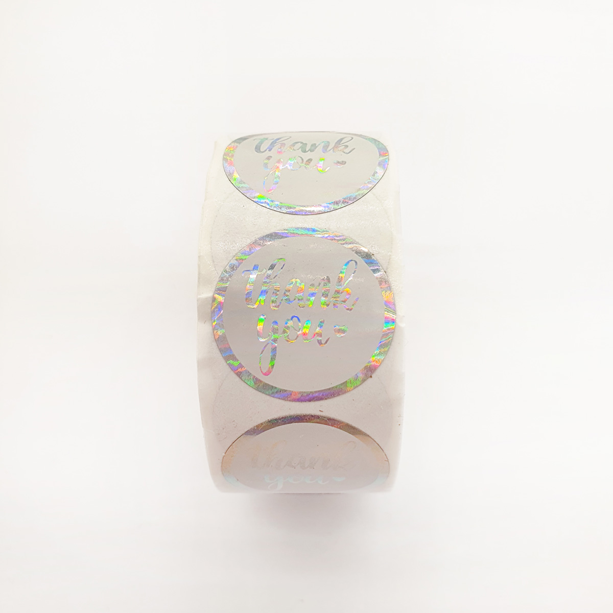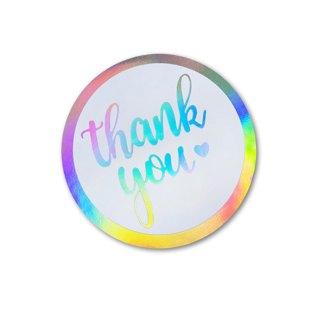 Samolepky Thank You na obaly Vašeho ručně vyráběného zboží. Bílá samolepka s duhovým okrajem a textem: Thanks You.