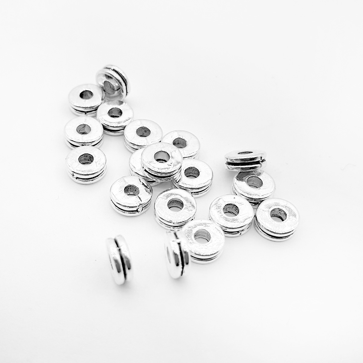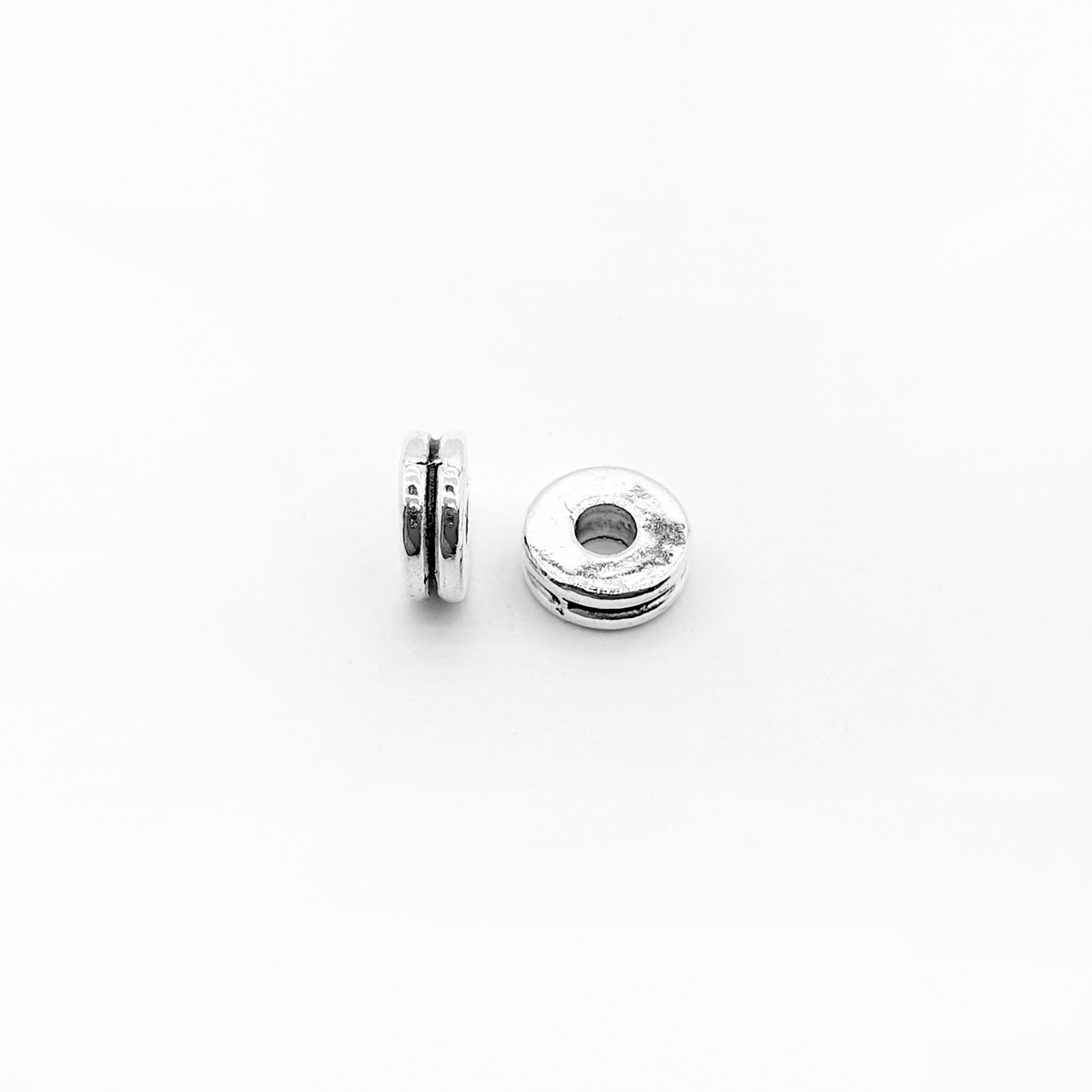 Kovový ozdobný korálek, který je možné využít buďto jako dělící korálek mezi dřevěné námi nabízené korálky (Dřevěné korálky). Jako průtahový materiál můžete zvolit kůži nebo šňůrku, průtah je 2mm.
