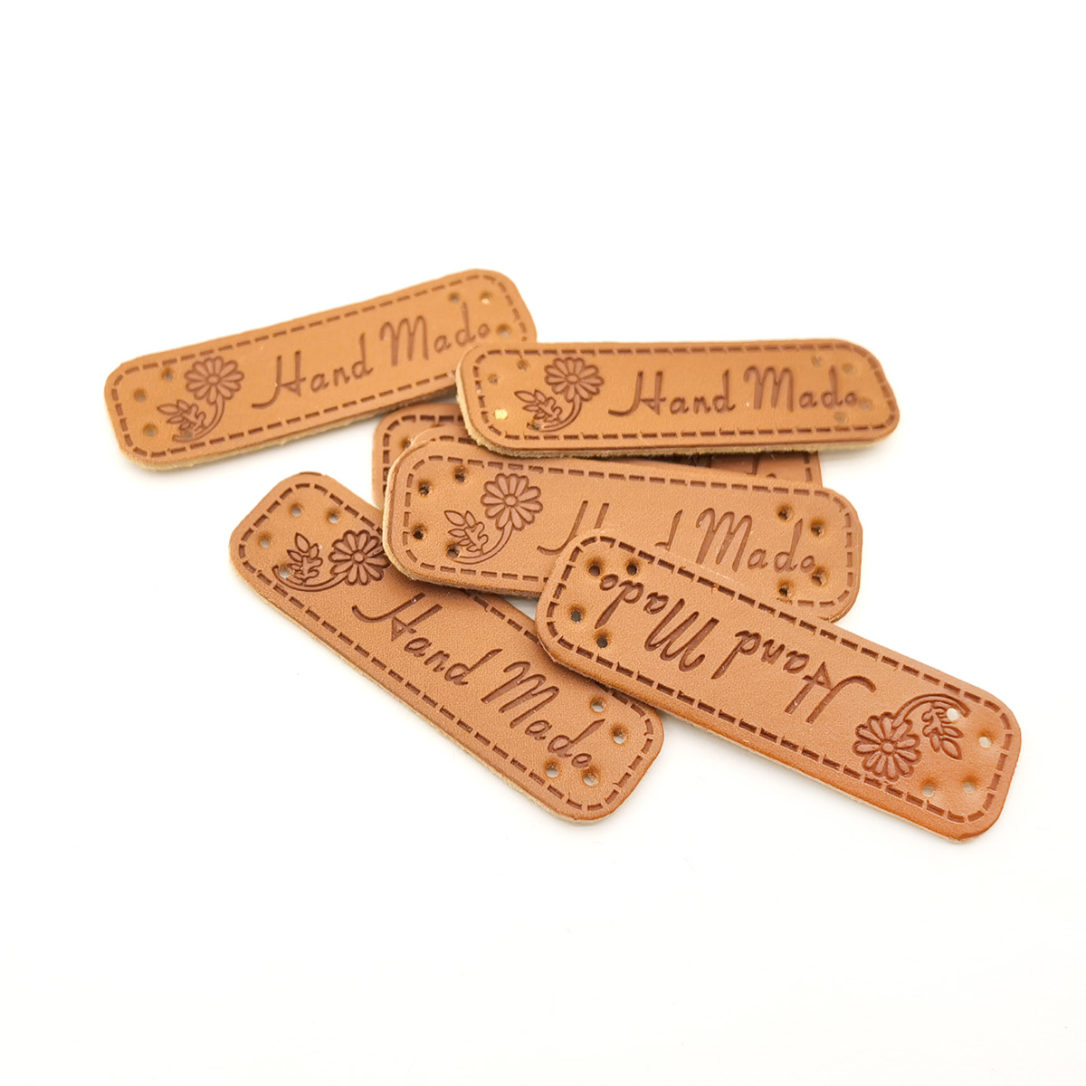 Kožené štítky (umělá kůže) na vaše výrobky s nápisem Hand Made se symbolem kytička ručnímu přišití a označení Vámi ručně vyráběného zboží. Štítky jsou v následujícím barevném vyhotovení: světle hnědý podklad a tmavohnědý text hand made a ikonou kytičky.