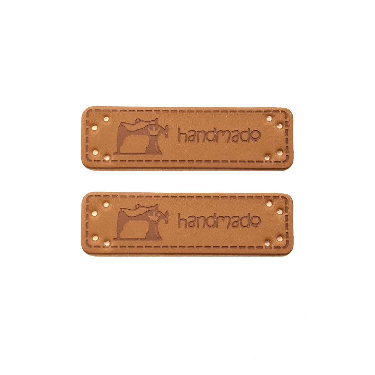 Kožené štítky (umělá kůže) na vaše výrobky s nápisem Hand Made se symbolem šicího stroje ručnímu přišití a označení Vámi ručně vyráběného zboží. Štítky jsou v následujícím barevném vyhotovení: světle hnědý podklad a tmavohnědý text hand made a ikonou šicího stroje.