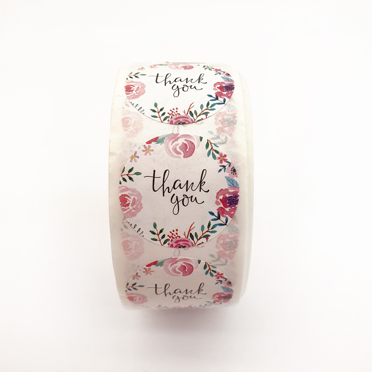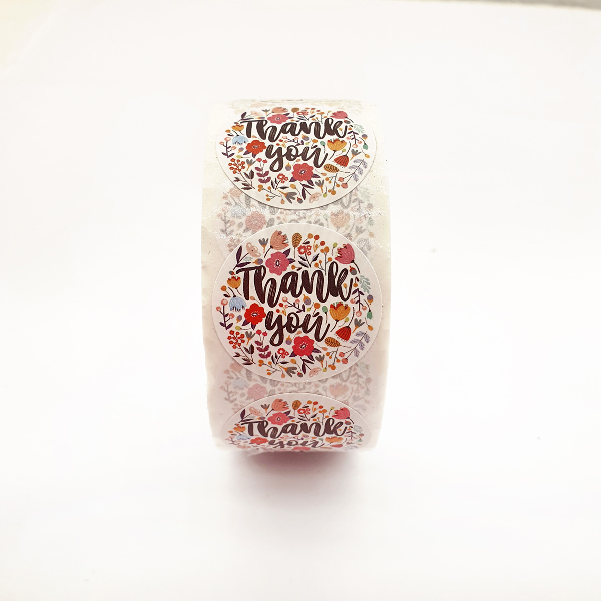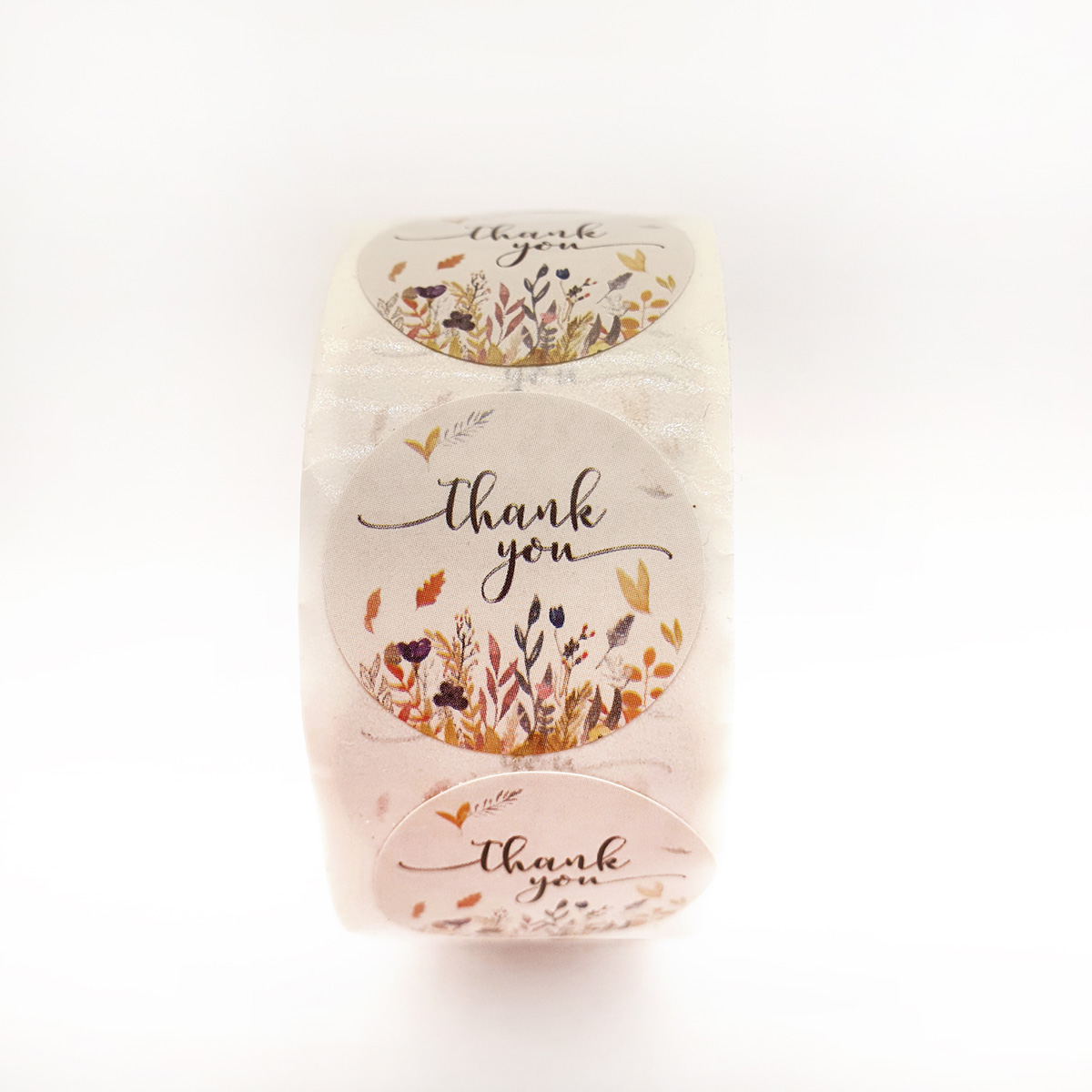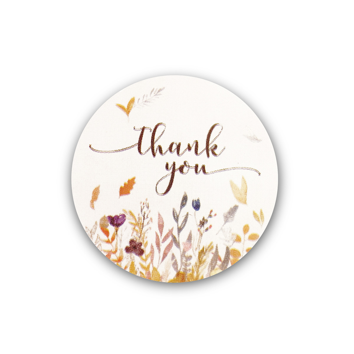 Samolepky Thank You s květinkami na obaly Vašeho ručně vyráběného zboží. Bílá samolepka s dekorem květinek a textem: Thanks You.